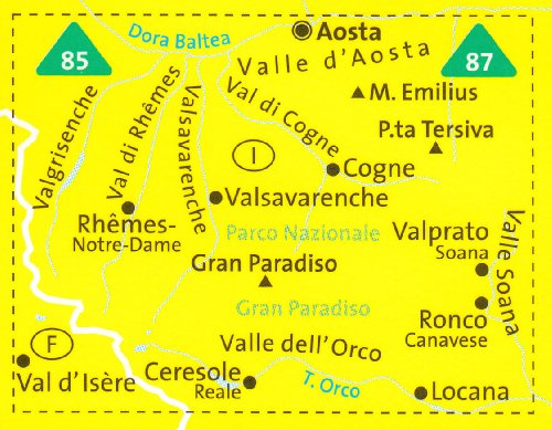PN Gran Paradiso, Val d'Aoste, Orco Valle dell '(Italie) 1:50.000 randonnée topographique, le cyclisme et le ski de randonnée carte n ° 86 KompassMaps pdf download - Gran Paradiso - Val d'Aoste région des Alpes italiennes sur un GPS de randonnée compatible et une carte de plaisance à 1:50.000 de Kompass en biens durables, papier synthétique imperméable et résistant à la déchirure. La couverture comprend Cogne, Valgrisenche, Val de Rhêmes, Valsavarenche, Val Soana et Val dell'Orco, ainsi qu'une section de la GTA - Grande Travesata delle Alpi chemin de randonnée pédestre. Ce titre fait partie d'une vaste série de cartes à pied de Kompass couvrant des domaines sélectionnés de l'Italie au 1:50.000 principalement, avec un GPS compatible, base profilée, topographique surimpression vaste pour la randonnée, les différents types d'hébergement, de nombreuses installations de loisirs, des lieux de intérêts, etc Contour intervalle varie en fonction du terrain de 100 m à 25m. Toutes les cartes mettent en évidence sentiers de randonnée locaux et, le cas échéant, des itinéraires de longue distance ou via ferrata sentiers. Les symboles indiquent les différents types d'hébergement tels que les auberges et sélectionnés hôtels, campings, cabanes de montagne et des refuges, etc La plupart des titres aussi montrer vélo ou vélo de montagne et / ou pistes de ski. Légende plan comprend l'anglais.